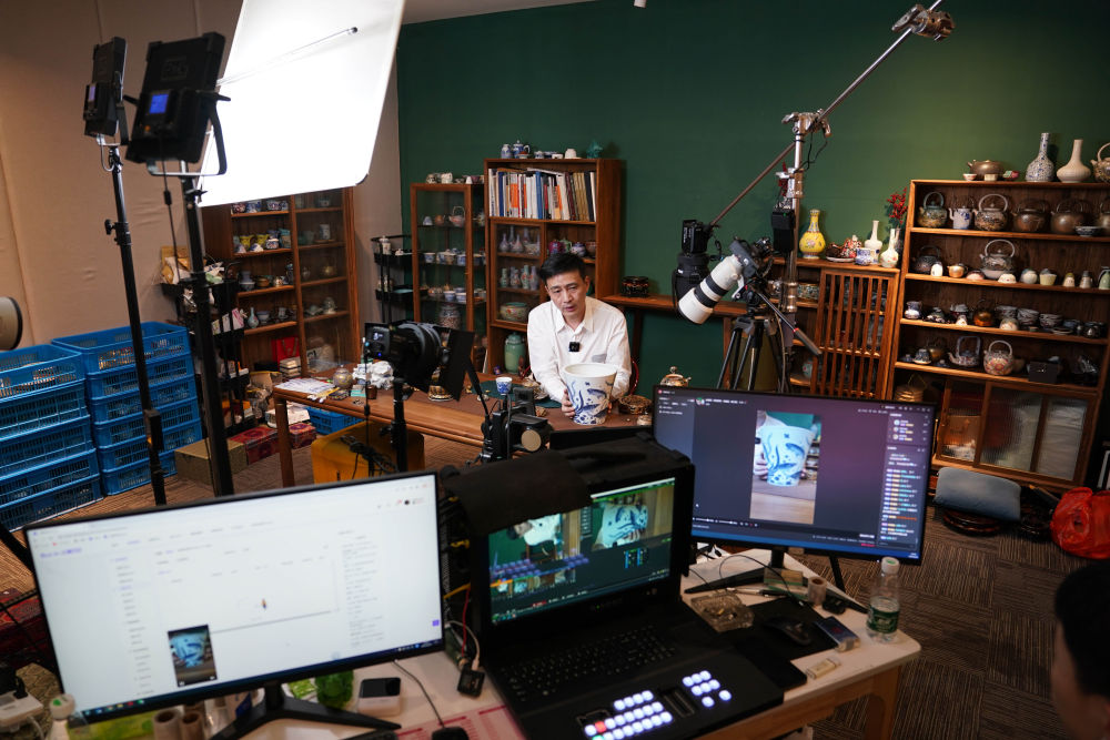 在江西景德鎮(zhèn)陶溪川文創(chuàng)街區(qū)的直播基地里,工作人員通過網(wǎng)絡(luò)直播推介陶瓷產(chǎn)品(2023年2月22日攝)。新華社記者 周密 攝