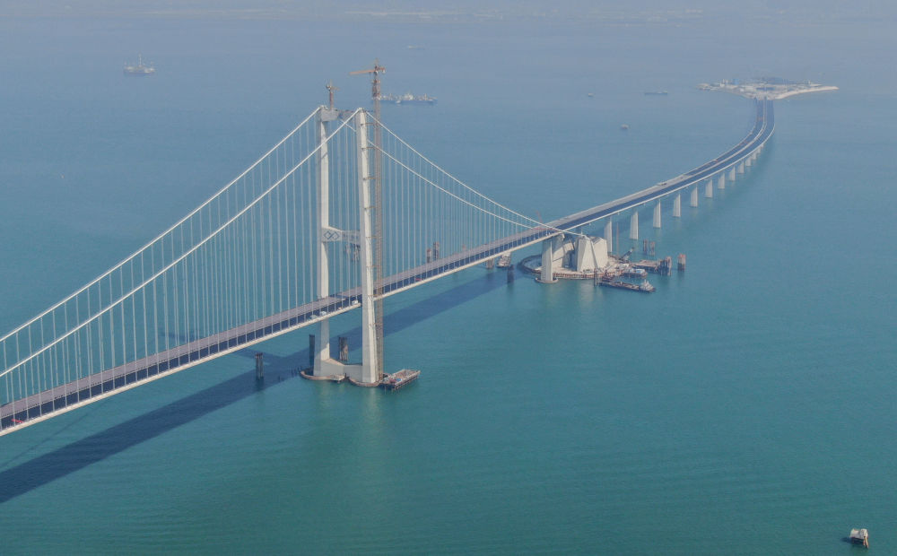 2023年11月28日,粵港澳大灣區(qū)超級工程深中通道主線正式貫通,這是深中通道伶仃洋大橋東塔及西人工島(無人機(jī)照片)。新華社記者 鄧華 攝