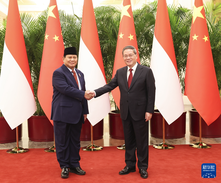 ??4月2日上午,國(guó)務(wù)院總理李強(qiáng)在北京人民大會(huì)堂會(huì)見(jiàn)印度尼西亞當(dāng)選總統(tǒng)普拉博沃。新華社記者 龐興雷 攝