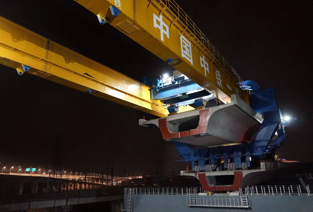 ??這是2024年3月4日凌晨拍攝的滬蘇湖鐵路全線最后一榀箱梁架設(shè)施工現(xiàn)場。當(dāng)日,滬蘇湖鐵路全線箱梁架設(shè)完成。