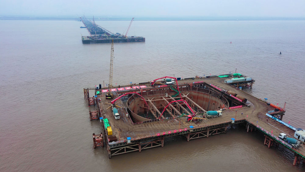 ??2024年3月27日,在江蘇啟東長江入海口北支航道江面施工現(xiàn)場,上海至南京至合肥高鐵控制性節(jié)點(diǎn)工程——崇啟公鐵長江大橋3、4號(hào)主墩承臺(tái)首次澆筑完成。