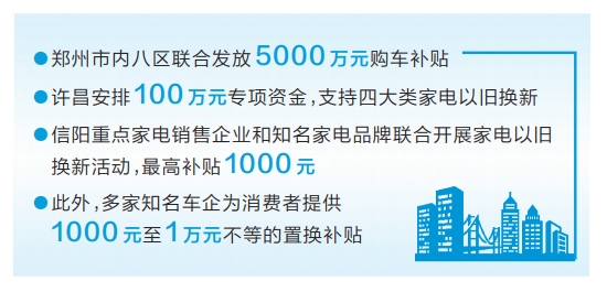 據(jù)了解,鄭州、開封等地及不少企業(yè)均開展了以舊換新促銷補(bǔ)貼活動(dòng)。其中,鄭州市內(nèi)八區(qū)聯(lián)合發(fā)放5000萬(wàn)元購(gòu)車補(bǔ)貼;許昌安排100萬(wàn)元專項(xiàng)資金,支持四大類家電以舊換新;信陽(yáng)重點(diǎn)家電銷售企業(yè)和知名家電品牌聯(lián)合開展家電以舊換新活動(dòng),最高補(bǔ)貼1000元。此外,多家知名車企為消費(fèi)者提供1000元至1萬(wàn)元不等的置換補(bǔ)貼。值得關(guān)注的是,此次以舊換新“綠意”十足。各大家電家居企業(yè)聚焦智能智聯(lián)產(chǎn)品推出優(yōu)惠活動(dòng);開封開展家電專項(xiàng)節(jié)能補(bǔ)貼活動(dòng),單件商品可補(bǔ)貼5%至20%。