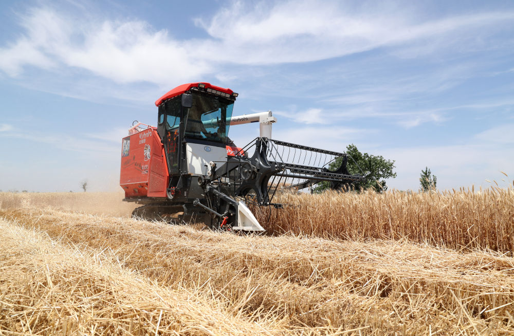 2024年5月27日,安徽省蒙城縣樂土鎮(zhèn)農(nóng)民駕駛農(nóng)機(jī)搶收小麥。新華社發(fā)(胡衛(wèi)國(guó)攝)