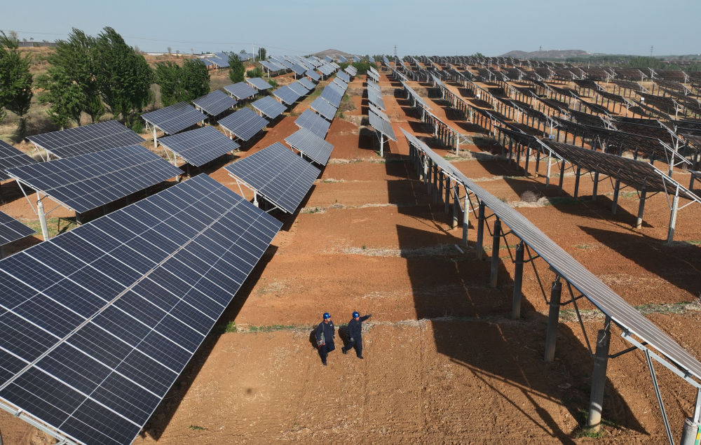 ??2024年4月16日,工人在河北省石家莊市靈壽縣譚莊鄉(xiāng)程家莊村的“農(nóng)光互補”光伏發(fā)電場巡查(無人機照片)。新華社記者 楊世堯 攝