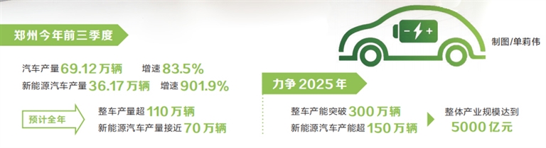 “今年前三季度,鄭州汽車產(chǎn)量69.12萬輛、增速83.5%,新能源汽車產(chǎn)量36.17萬輛、增速901.9%。預(yù)計全年整車產(chǎn)量超110萬輛,新能源汽車產(chǎn)量接近70萬輛。”鄭州市政府相關(guān)負責(zé)人表示,鄭州正在加快建設(shè)全國重要的新能源及智能網(wǎng)聯(lián)汽車研發(fā)和生產(chǎn)基地,力爭2025年整車產(chǎn)能突破300萬輛、新能源汽車產(chǎn)能超150萬輛,整體產(chǎn)業(yè)規(guī)模達到5000億元。