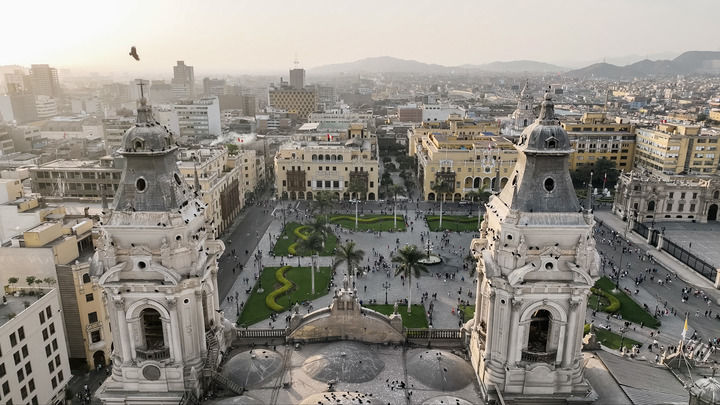 ??這是10月13日拍攝的秘魯首都利馬武器廣場(chǎng)(無(wú)人機(jī)照片)。新華社記者 李木子 攝