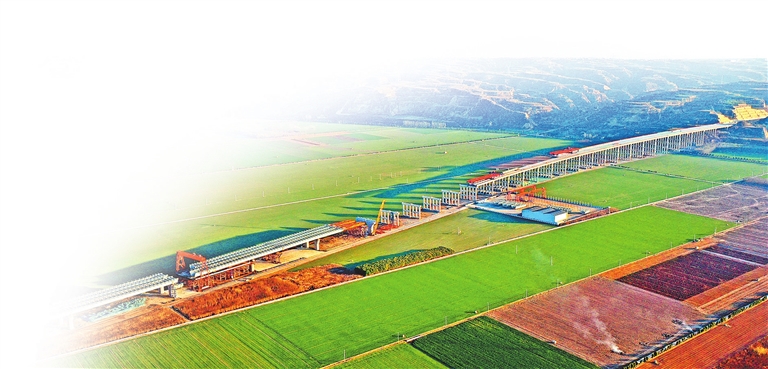 ??12月16日,孟州市境內(nèi),良田沃野間,沁伊高速黃河特大橋正在提速建設(shè)。中原大地一片生機。 白水平 攝