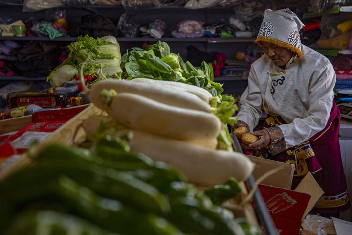??在西藏那曲市申扎縣馬躍鄉(xiāng)貝嘎四村偏遠鄉(xiāng)鎮(zhèn)果蔬配送試點項目直銷點,店主西熱加措在整理供銷合作社配送來的新鮮蔬菜(2024年1月5日攝)。新華社記者 姜帆 攝
