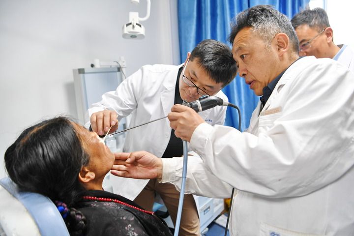 ??中國醫(yī)學(xué)科學(xué)院整形外科醫(yī)院王克明博士(左后)和西藏自治區(qū)人民醫(yī)院巴羅主任(右前)為患者查體(2024年8月27日攝)。新華社記者 張汝鋒 攝