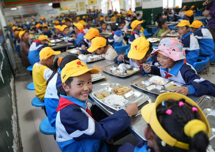 ??西藏林芝市工布江達縣娘蒲鄉(xiāng)中心小學(xué)學(xué)生在食堂用餐(2024年9月3日攝)。新華社記者 晉美多吉 攝