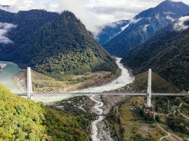 ??2019年10月27日拍攝的川藏公路通麥路段上的迫龍溝特大橋(無人機照片)。迫龍溝特大橋位于西藏林芝市波密縣境內(nèi),是西藏自治區(qū)內(nèi)最大的公路雙塔斜拉橋。新華社記者 孫非 攝